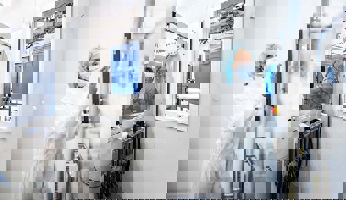 I första delen hittar du vår renrumsproduktion. Här står halva maskinerna ute i det fria och halva maskinerna inne i ett renrum. Inne i renrummet hittar du en eller flera operatörer som iklädda utrustning för renrum 8D, kontrollerar och paketerar produkterna.
